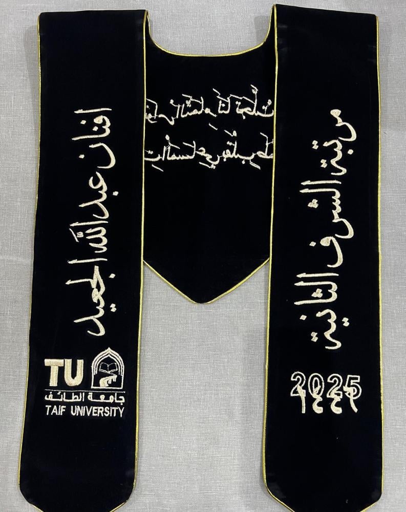 احتفلي بتخرجك بوشاح تخرج فريد من نوعه مصنوع من أجود أنواع الأقمشة. تصميم عربي أصيل يجمع بين الأناقة والرقي. يمكن تخصيص الوشاح باسمك وتاريخ التخرج وشعار جماعتك. قطعة فنية ستظل ذكرى جميلة لواحدة من أهم مراحل حياتك.