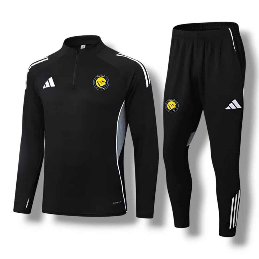 طقم تمارين نادي النصر السعودي الون اسود مع بنطلون الجديد لموسم 2025-2026.